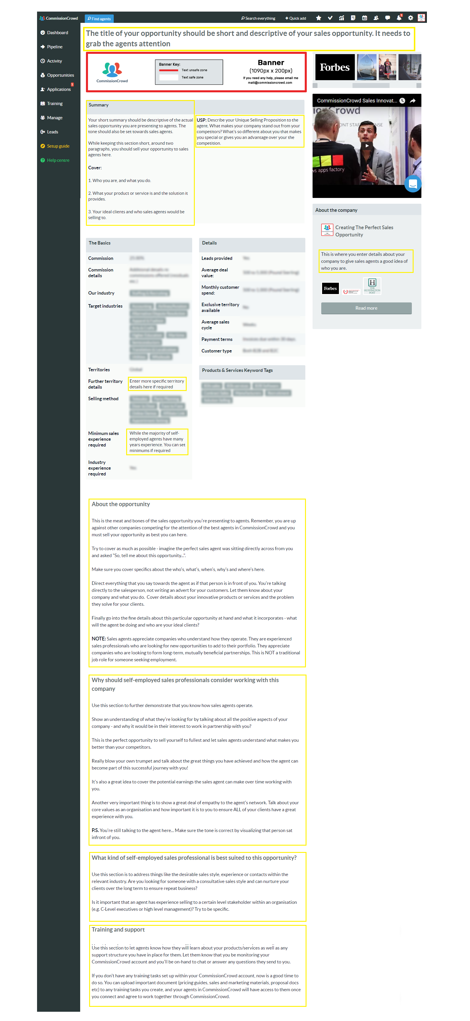 Creating the perfect independent sales opportunity for experienced self-employed sales reps on CommissionCrowd is fundamental to ensuring that your company attracts the very best salespeople to work in partnership with and drive your sales forward.