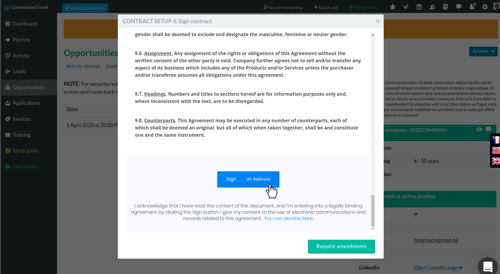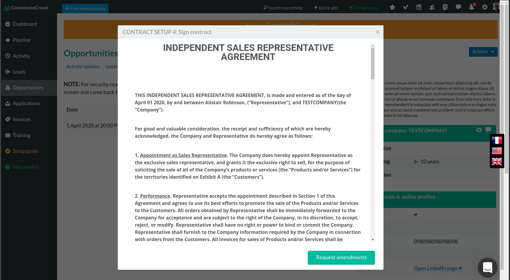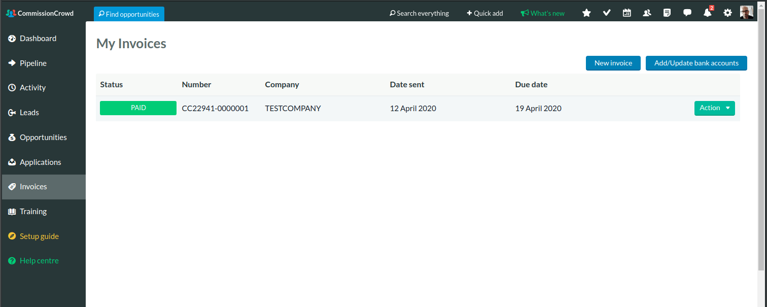 Recently we implemented a big chunk of new functionality, called the Deal Manager. It allows companies to manage contracts, invoices, and payments within CommissionCrowd, and for sales agent members, it's the same idea: you don't have to leave the platform to sign your contract or to send invoices and receive payments. Plus everything is stored, managed, and tracked in one place.