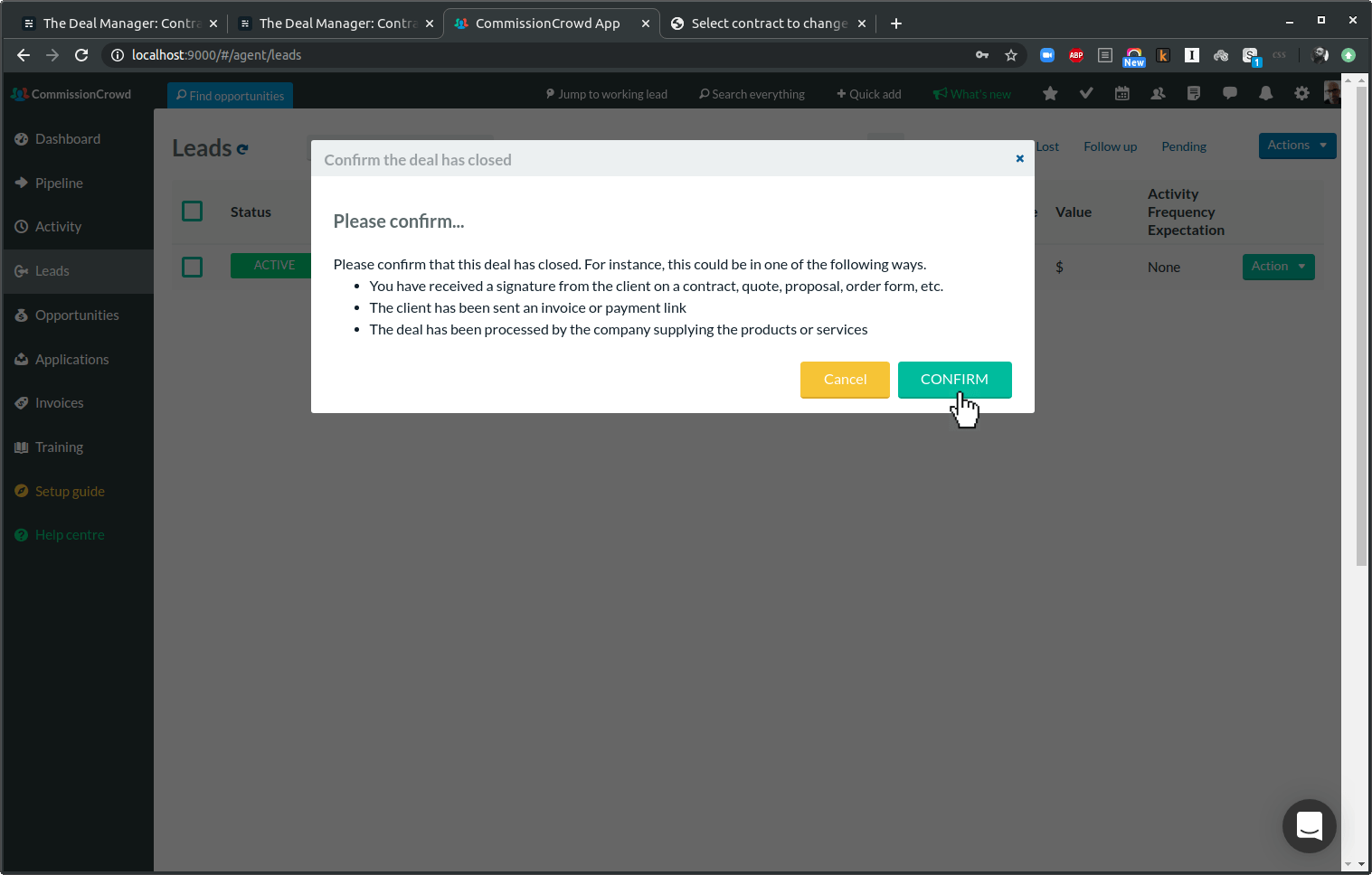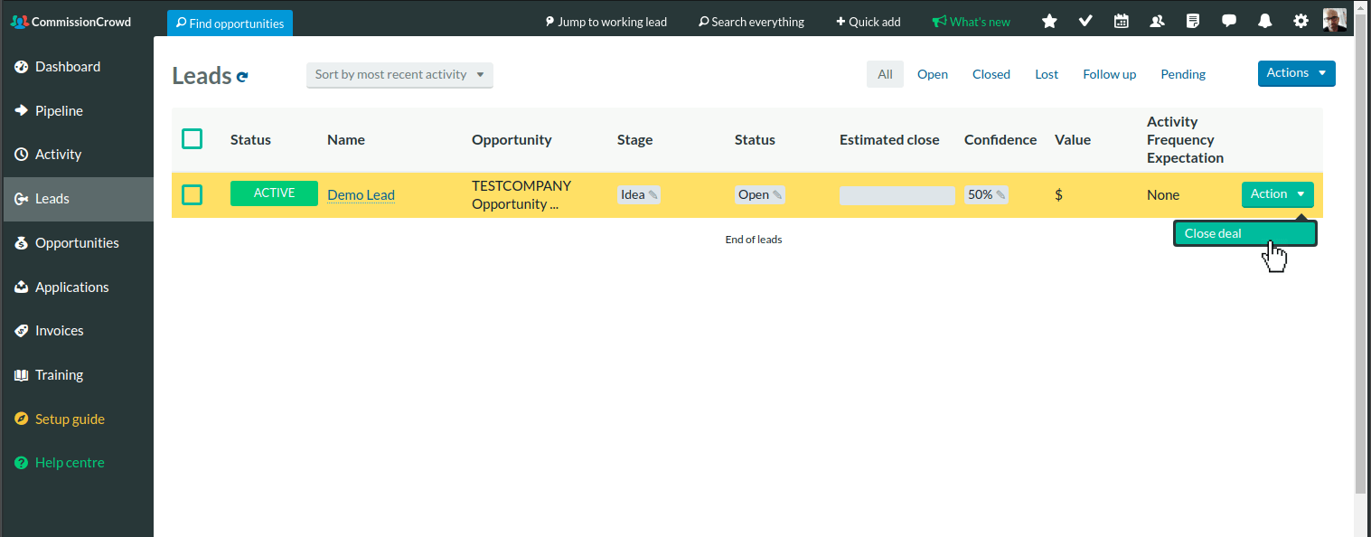 To get paid for your work on an opportunity, you start by closing a deal. A deal is always based on one of your existing leads. So when you've made the sale and everything is confirmed, you go to the relevant lead and click on Close Deal.