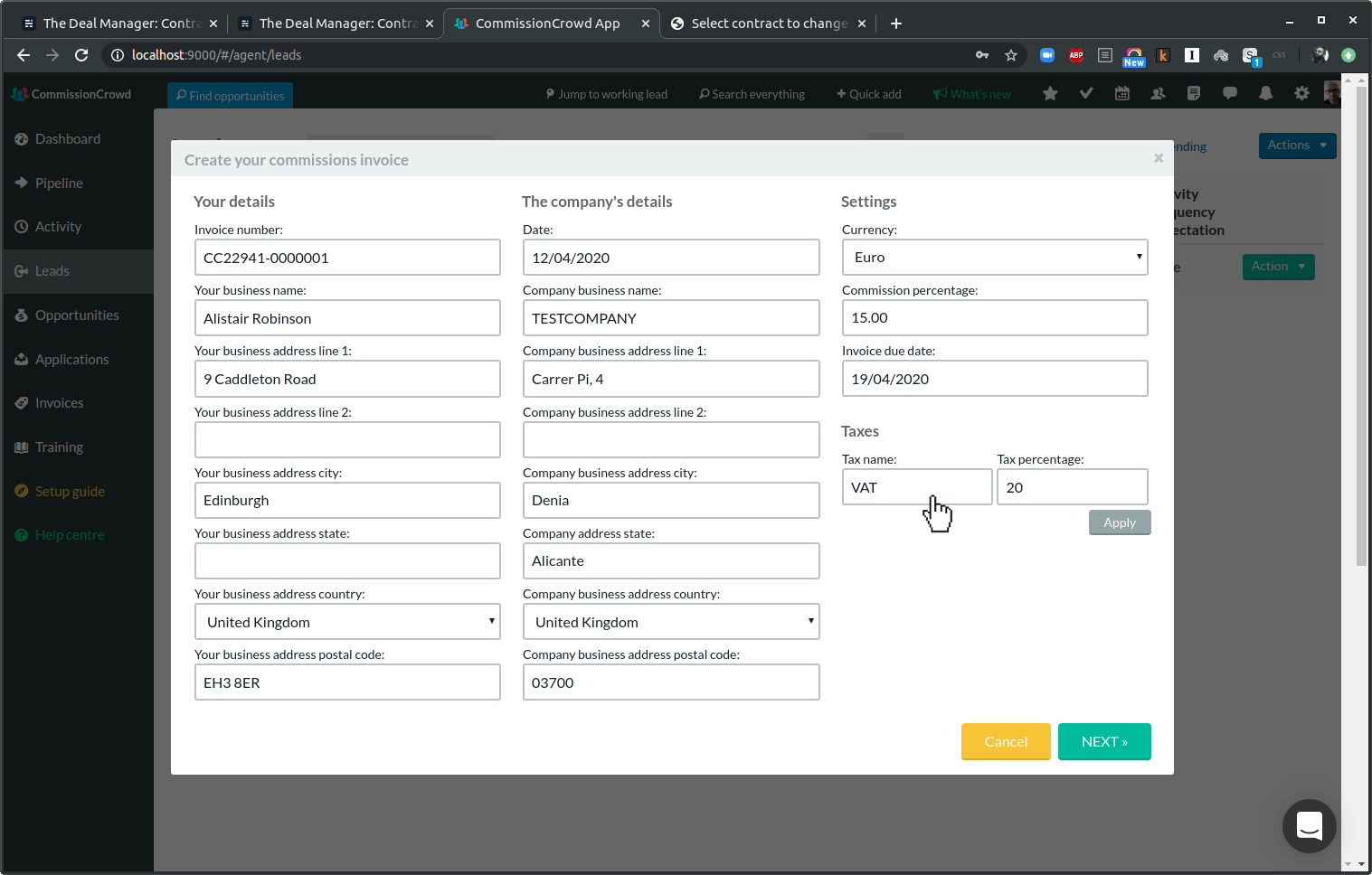 The first step in creating the invoice is the form shown above, which will be pre-populated, but which you can edit if necessary. The one thing you may have to add here is tax, e.g., VAT, IVA, etc. You can add multiple taxes here if necessary. Make sure you click Apply to make the tax available for the invoice in the next screen.