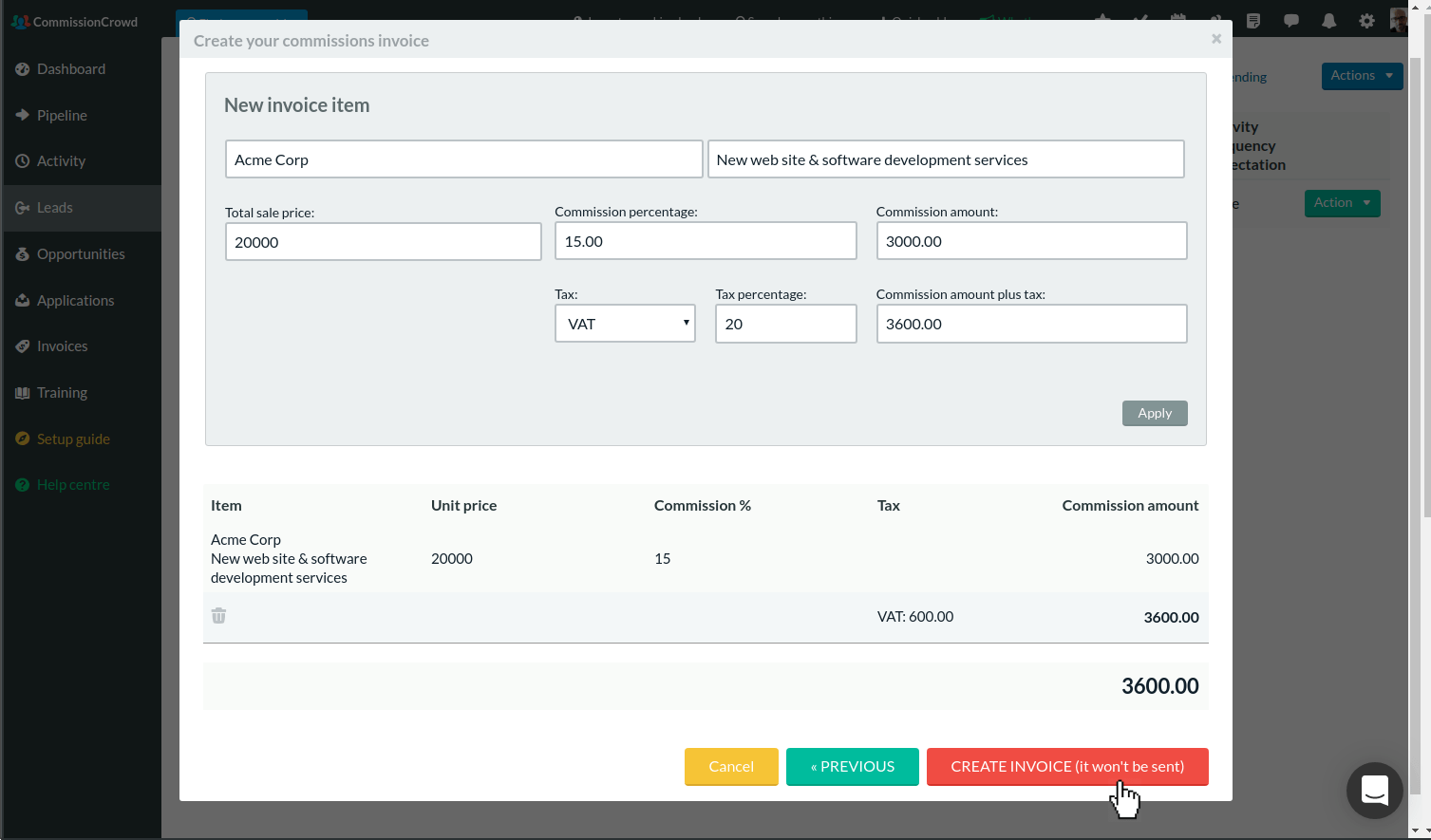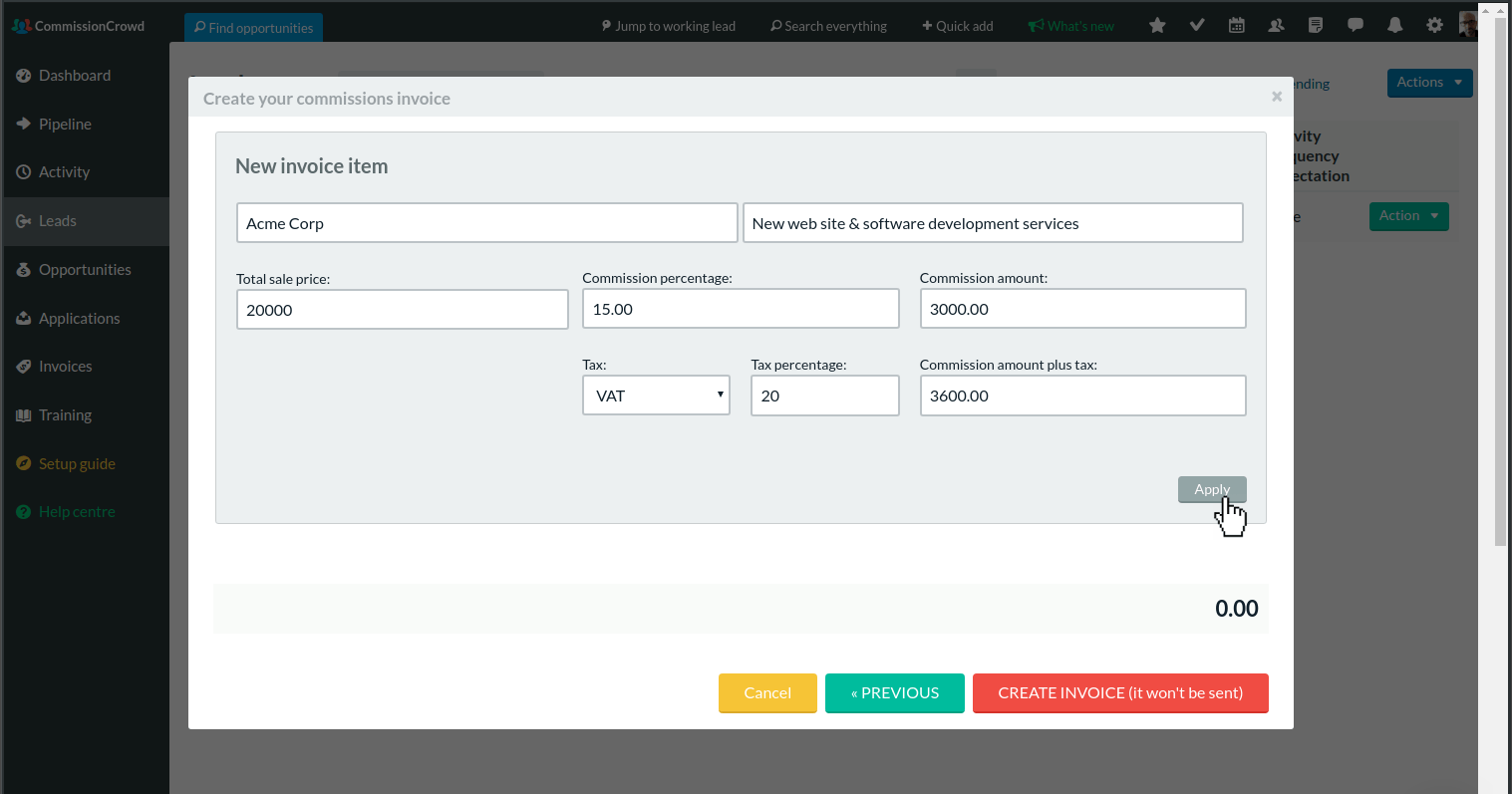 On this screen you can build your invoice by adding multiple items. To add an item, fill in the form, select a tax if applicable, and click on Apply. The commission amount due to you will be calculated automatically.
