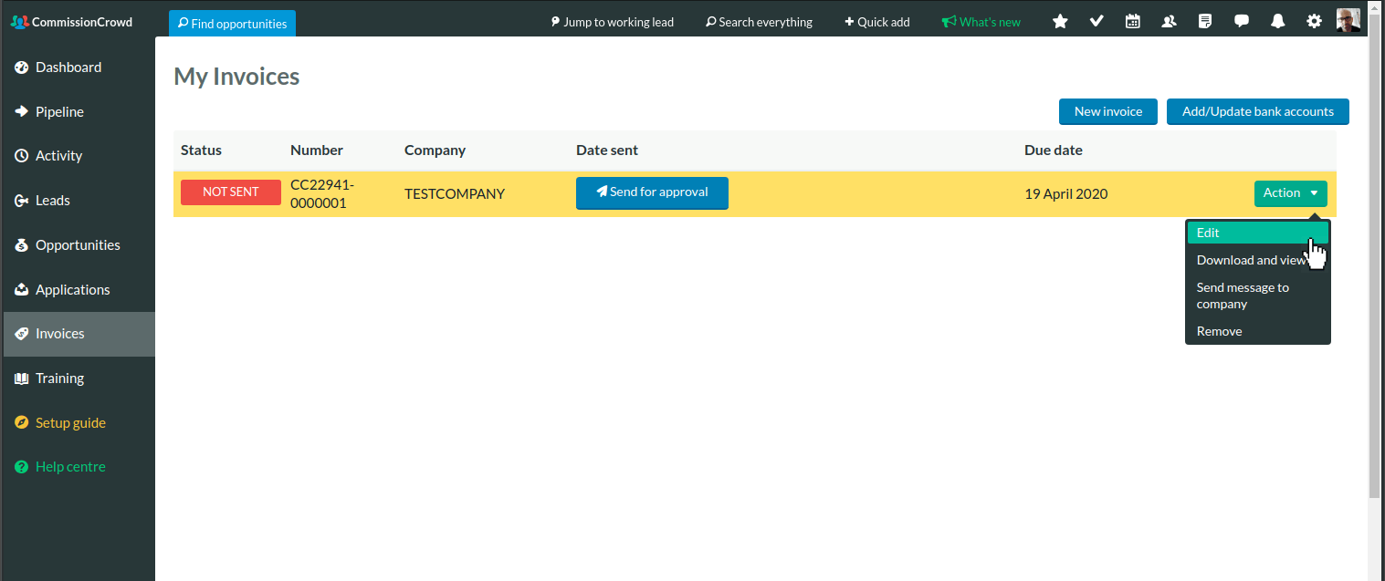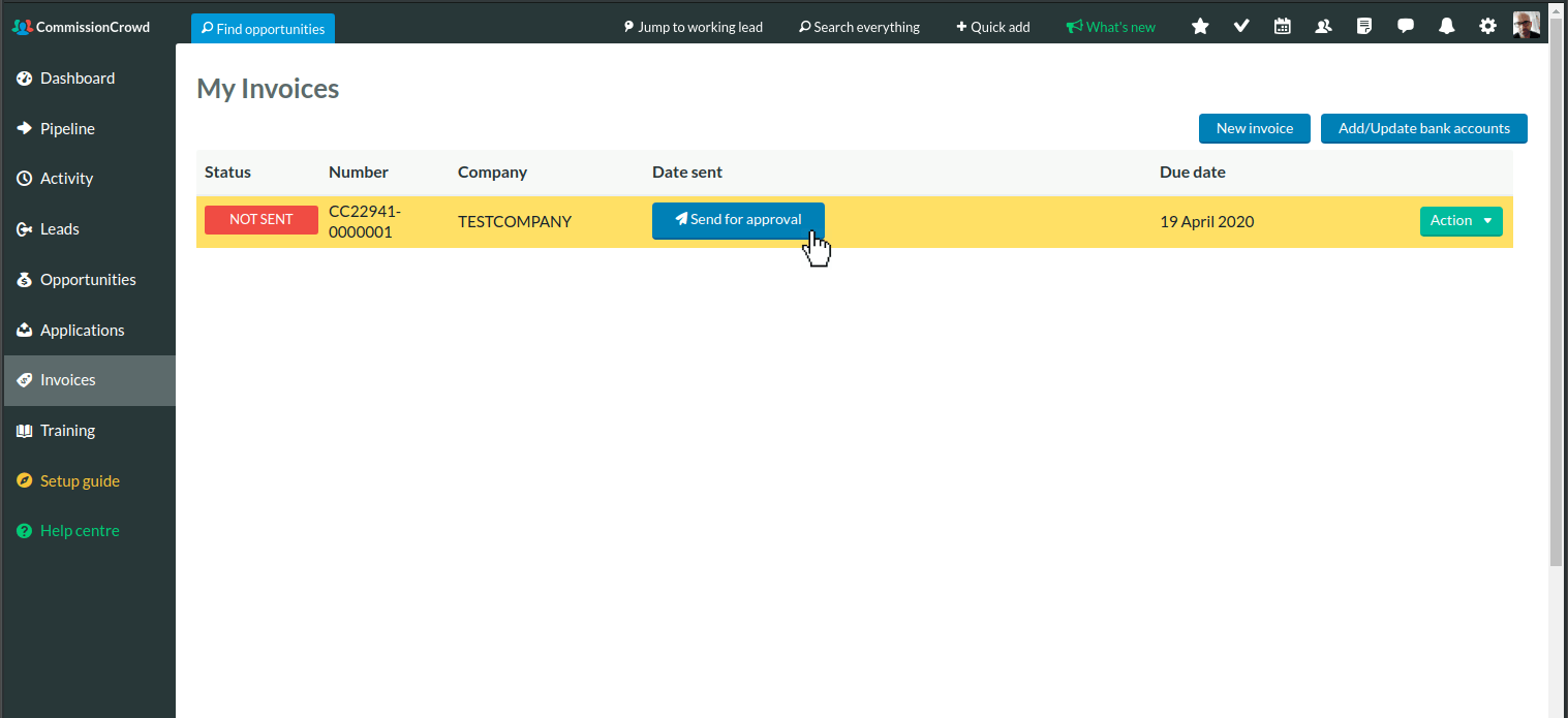 When you're happy with the invoice, click on Send for approval. The company will be alerted and they'll have the option to view, approve, and pay it.