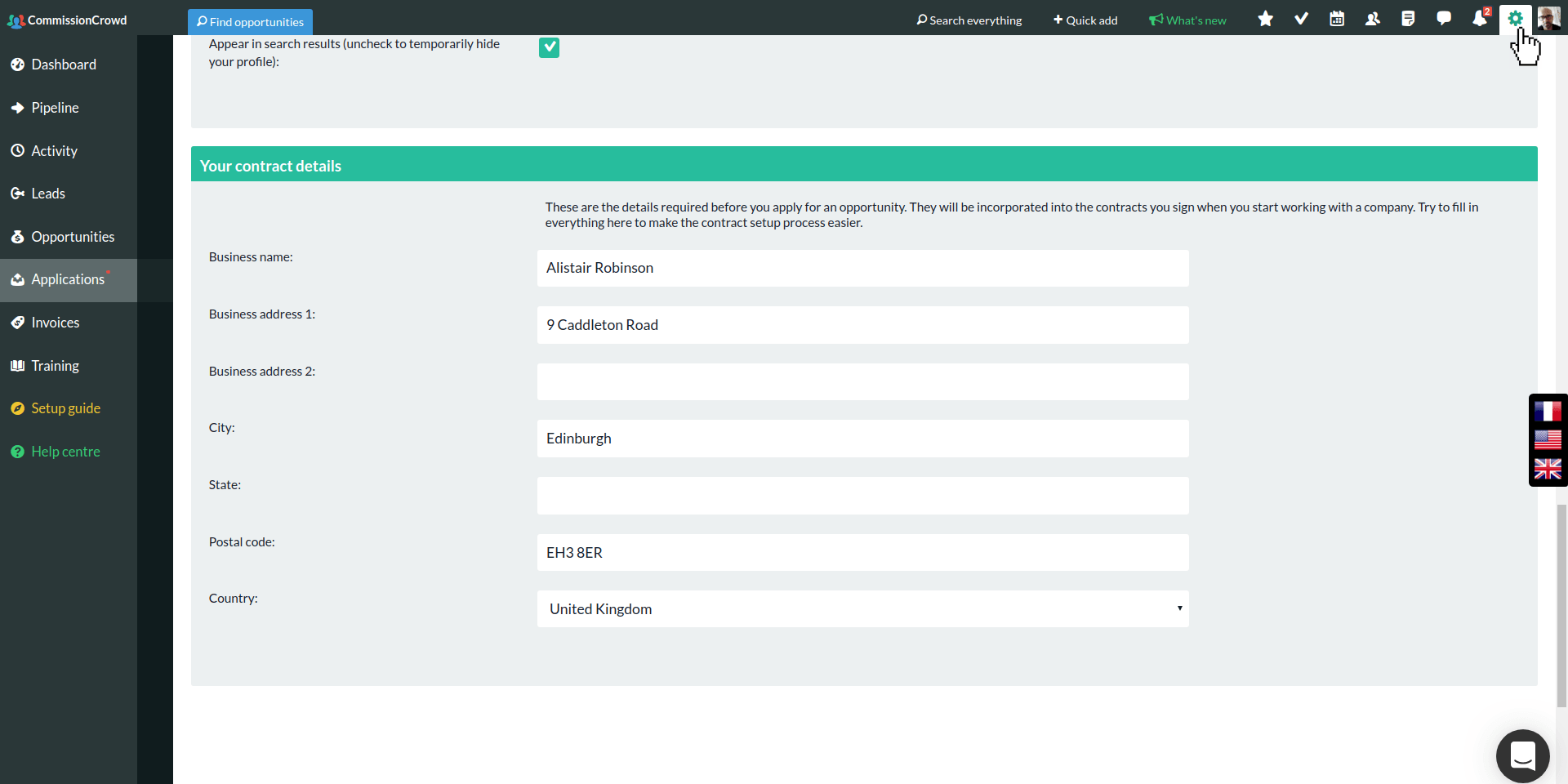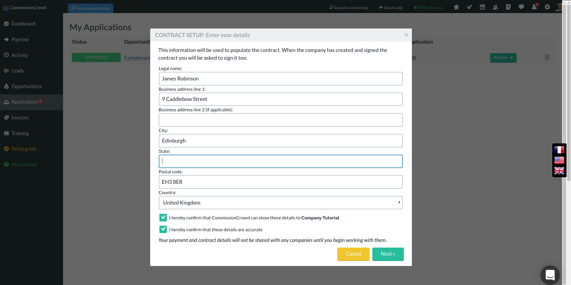 Enter your details as you want them to appear on your contract. These should be your legal name, which could be a company name if you operate as a company.
