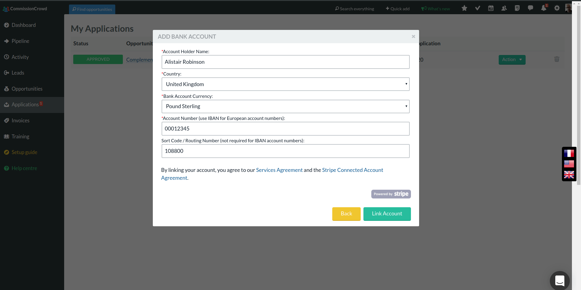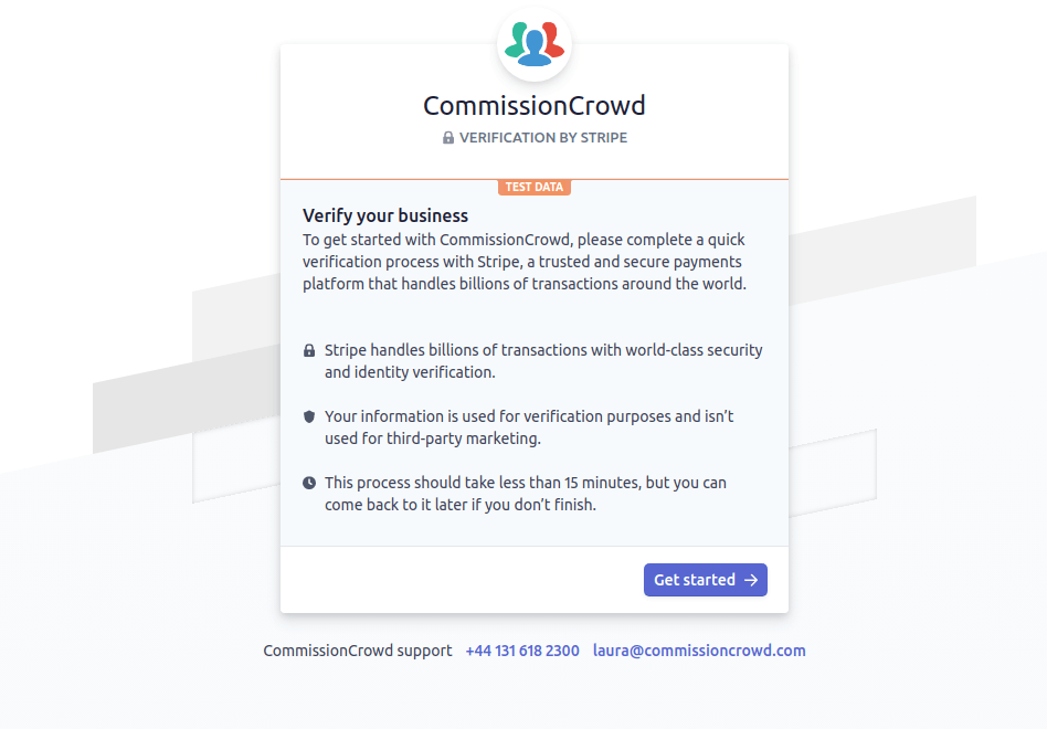 When you've entered your contract details and click the next button, you might have to go through the Stripe verification process. Stripe is the service we use for online payments, and you'll be directed away from CommissionCrowd to a step-by-step verification process. Once complete, you'll be taken back to CommissionCrowd to continue setting up your bank account and sign the contract.