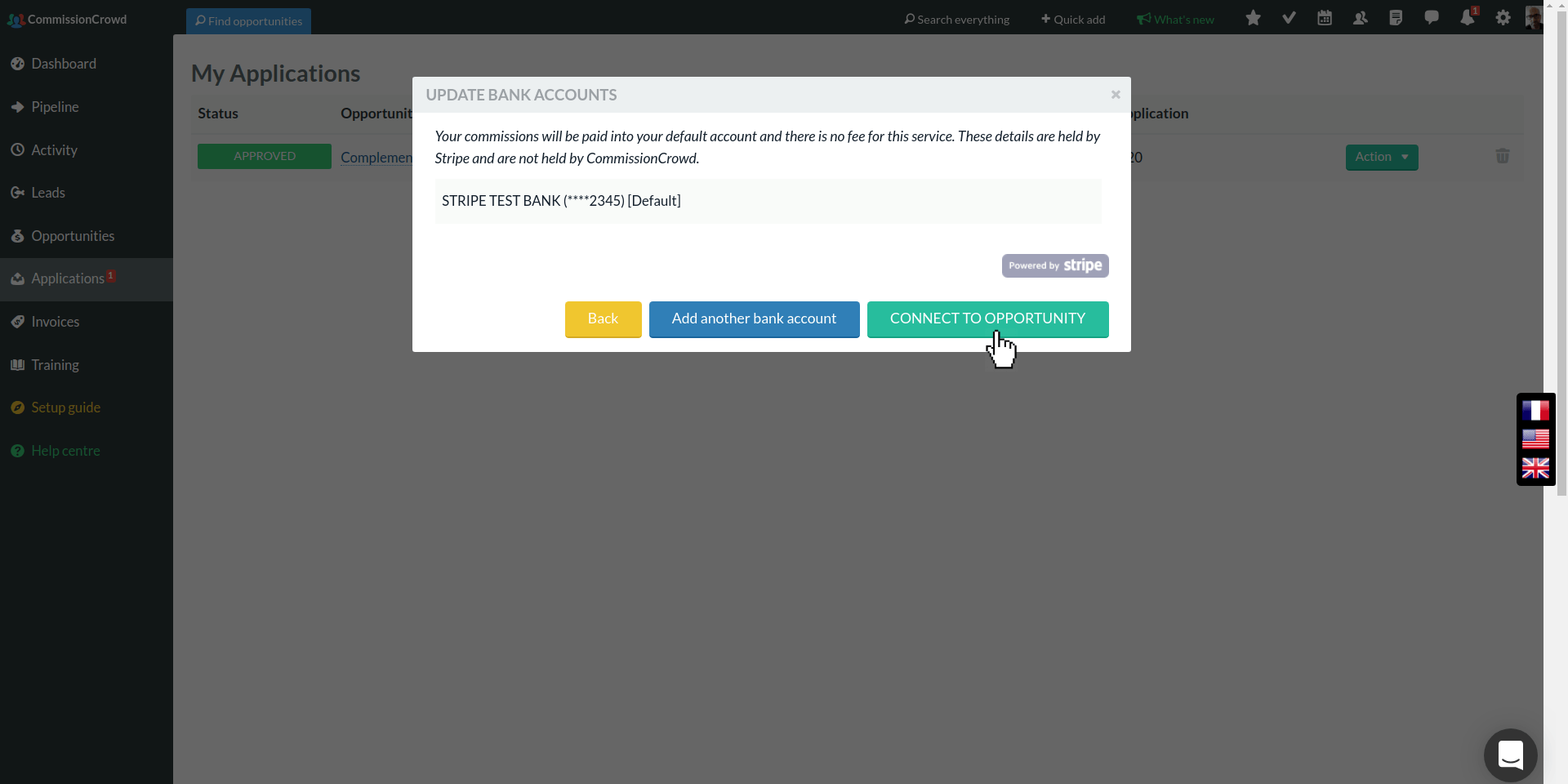 When the bank account is added, you can connect to the opportunity. Note that when you connect to other opportunities, you can add another bank account if you want to use a different one.